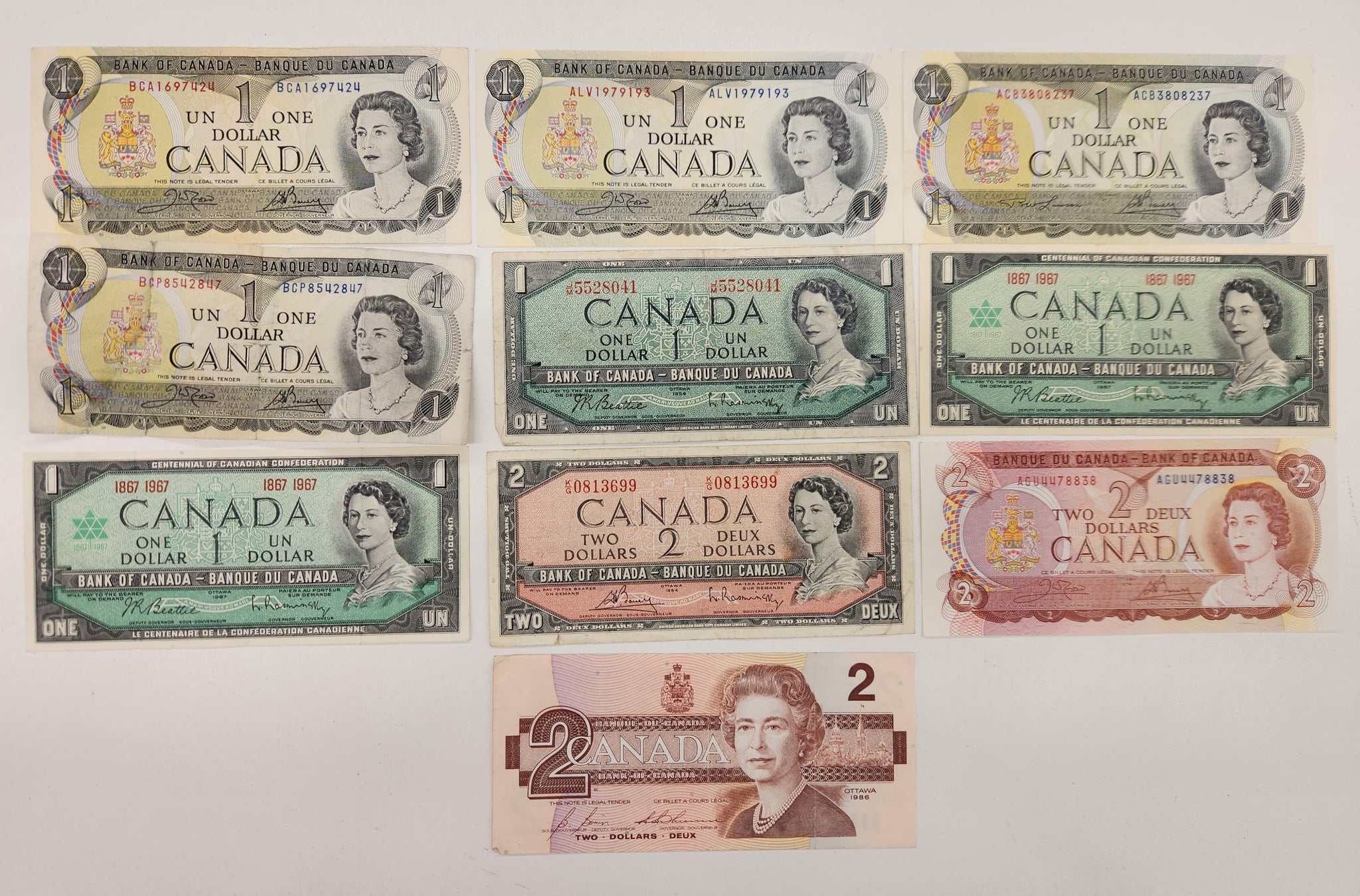 10 total bills.$1 1973: 3 crisp, 1 very worn$1 1954: 1 worn$1 1967: 2 crisp$2 1954: 1 slightly worn$2 1974: 1 crisp$2 1986: 1 slightly worn